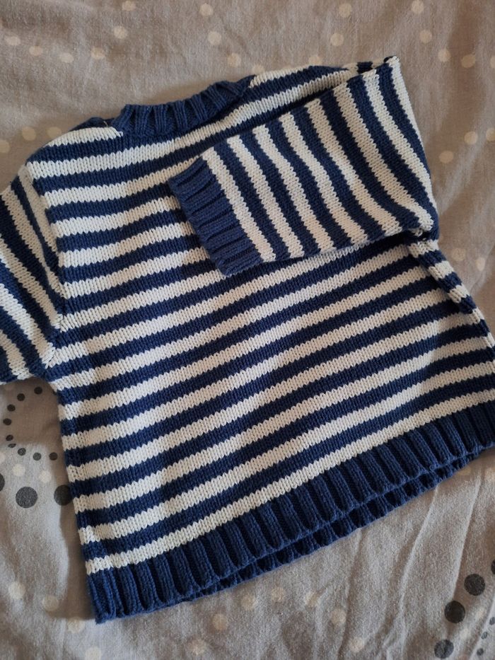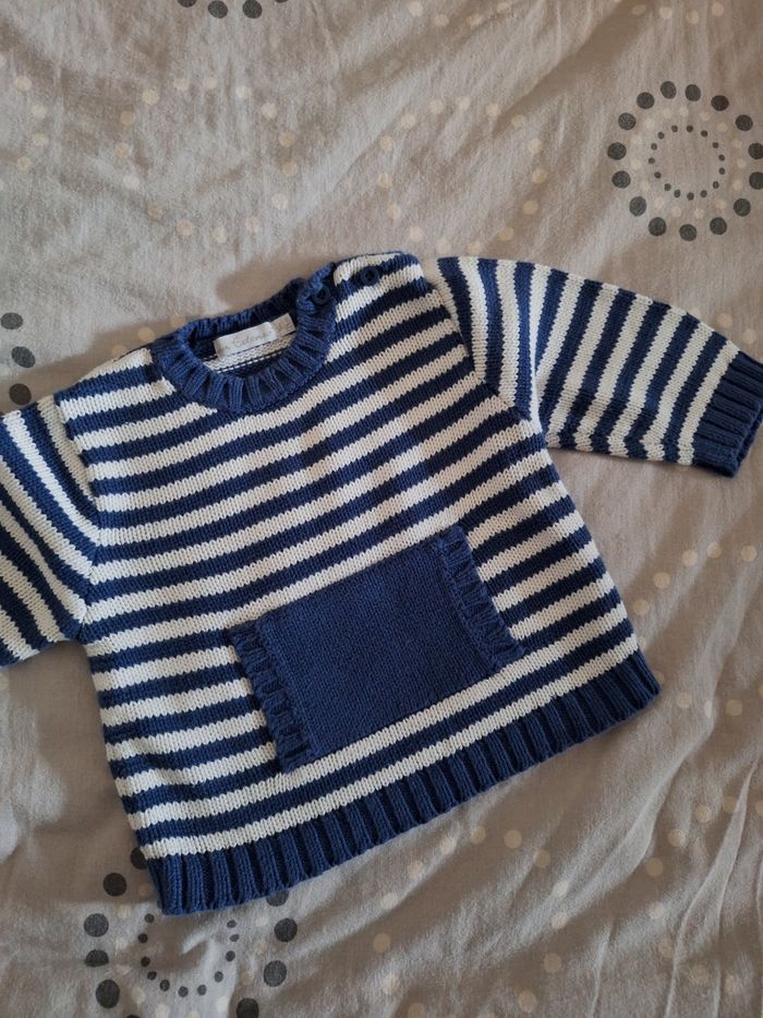 GARÇON 9 MOIS N°556 pull rayé Marin , bleu / blanc Bouton épaule 100% coton Taille 9 mois In extenso 2€ #kelly_garçon9mois