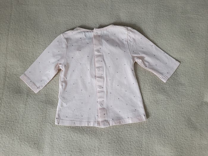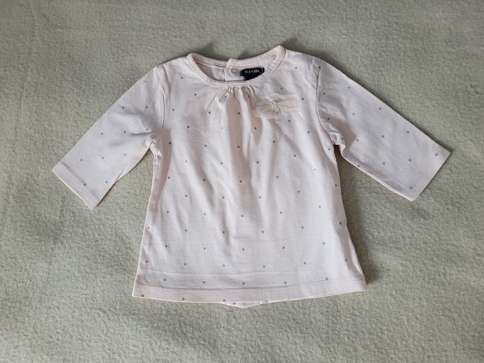 T-shirt manches longues kiabi 3 mois 62 cm Rose pâle à pois gris, flot sur l'avant En très bon état