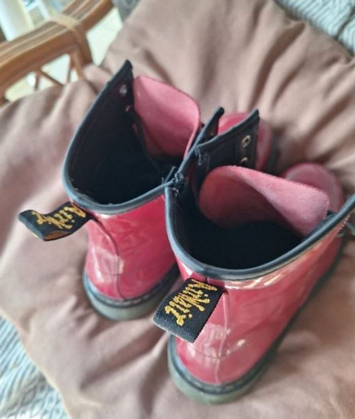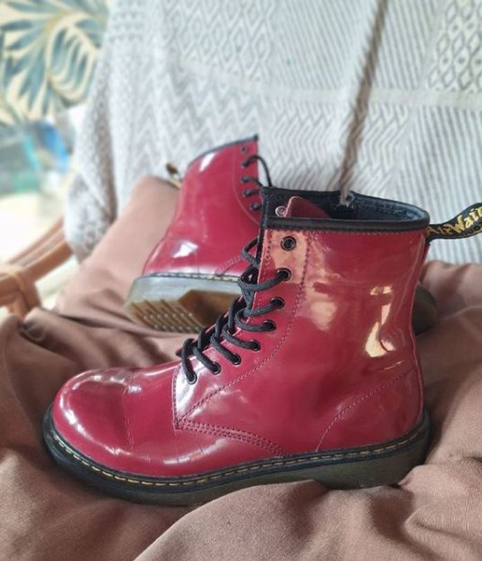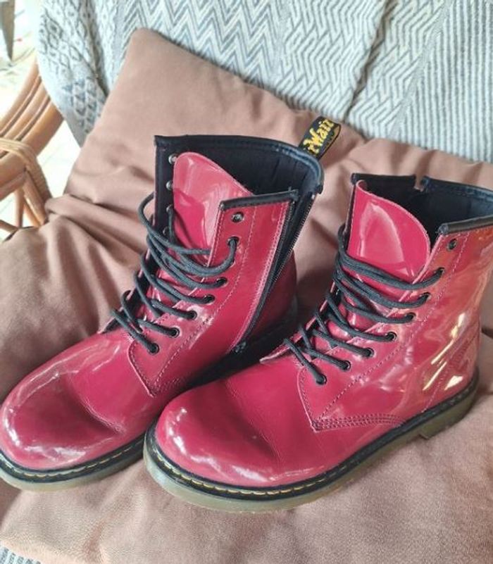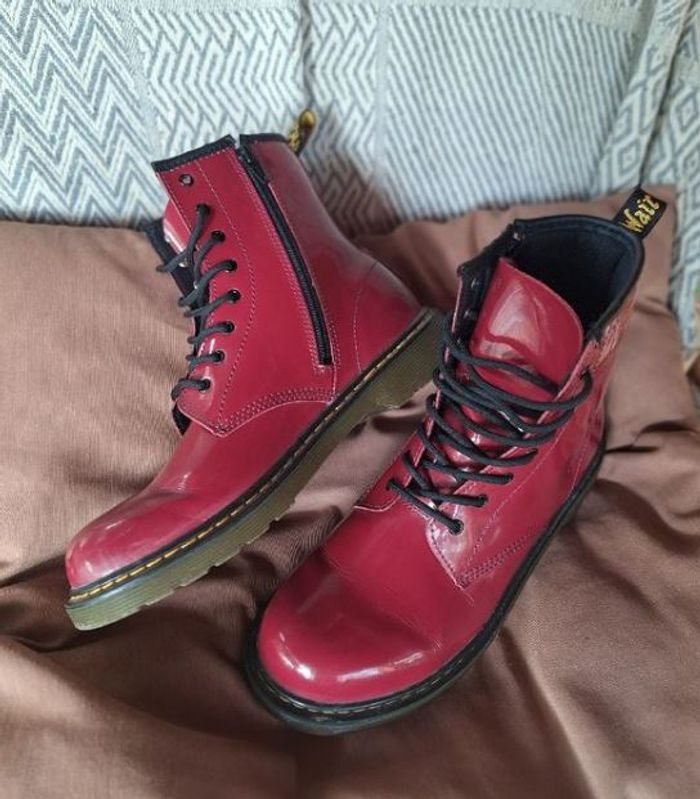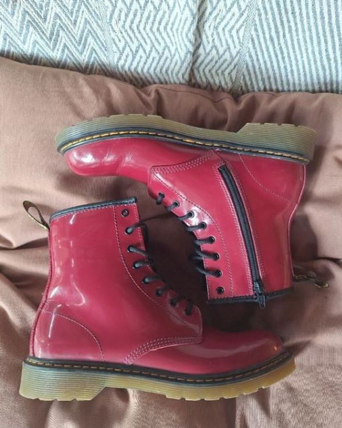 Dr Martens Scooter Red taille 38.5 qui convient à un 39 Modèle junior : comportent une fermeture éclair et sont rembourrées à l'intérieur ce qui les rend ultra confortable. Portées que quelques fois je n'assume malheureusement pas cette couleur. Aucune rayure Tige: 100% Cuir Doublure: 100% Textile Semelle: 100% PVC Je n'ai plus la boîte mais preuve d'achat sur Zalando si vous désirez.