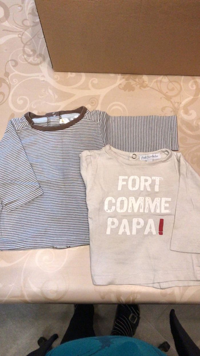 un tee shirt ML beige « j’aime mon papa » un tee shirt ML rayé bleu clair/marron taille 3 mois