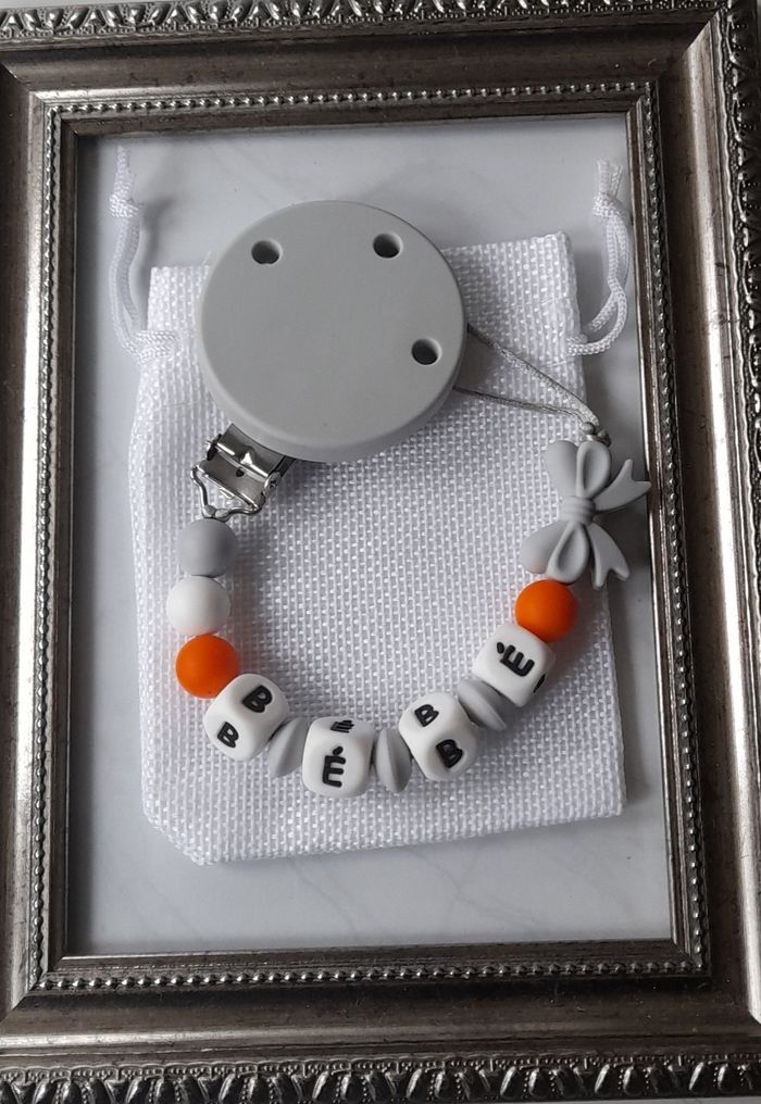 Attache tétine personnalisé avec le prénom de votre choix avec adaptateur et pochette cadeau. Réalisation et envoie sous 48h salon le stock disponible. Tout le matériel utilisé est aux normes européennes . Perles en silicone ou en bois ou un mélange selon les modèles . En respectant les normes de sécurité pour bébé ,n'hésitez pas à regarder dans mon dressing il y a plusieurs modèles et aussi à m'envoyer un message pour plus d'informations. 🔴 une petite remarque pour les prénoms qui sont très long il y aura forcément moins de perles sur les cotés ou quelques changements sur le modèle c'est pour respecter les normes de sécurité pour bébé il y a une langueur à respecter merci pour votre compréhension. 🔴Aussi l'utilisation de l'attache doit être sous la surveillance d'un adulte et toujours vérifier si l attache tétine est intacte et les nœuds sont toujours bien fermés pour la sécurité de nos boutchous. Je vous remercie pour la lecture de ces consignes.