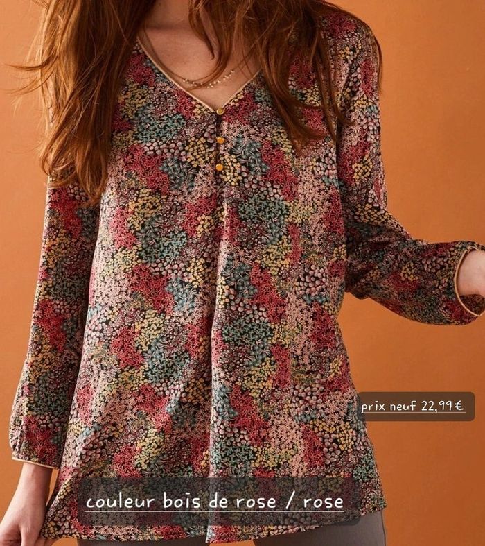 📖 Blouse évasée, col en V avec boutons dorés. Détails dorés et imprimé fleurs. Neuf, encore sous blister. Achetée 22,99€ sur le site Blancheporte. 🏷 Blancheporte 📏 Taille 38 🛍 D'autres articles dans mon dressing avec #femmeaurelilou34 📉💰 Réductions activées