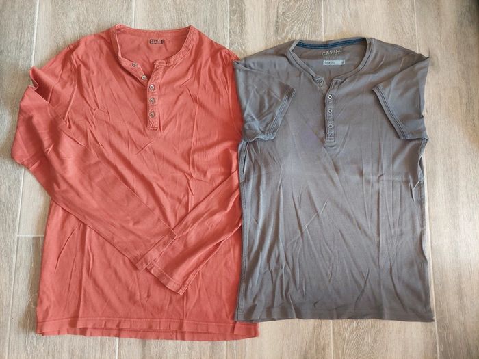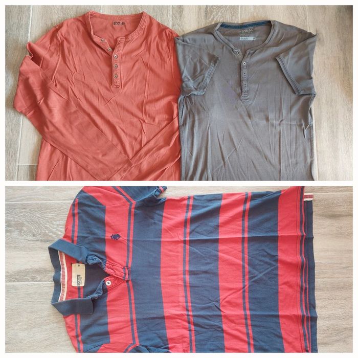 Lot de 3 t-shirts, taille M, marque Jules T-shirt couleur brique, manches longues T-shirt gris, manches courtes T-shirt bleu et rouge, manches courtes, petit trou au niveau de l'étiquette dans le cou. Bon état. #hommeaurelilou34