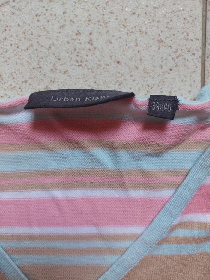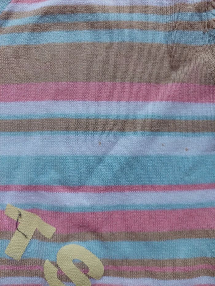 Pull à rayures, col V. 2 petits points colorés sur une bande blanche (voir photo). Kiabi, taille 38-40 #femmeaurelilou34