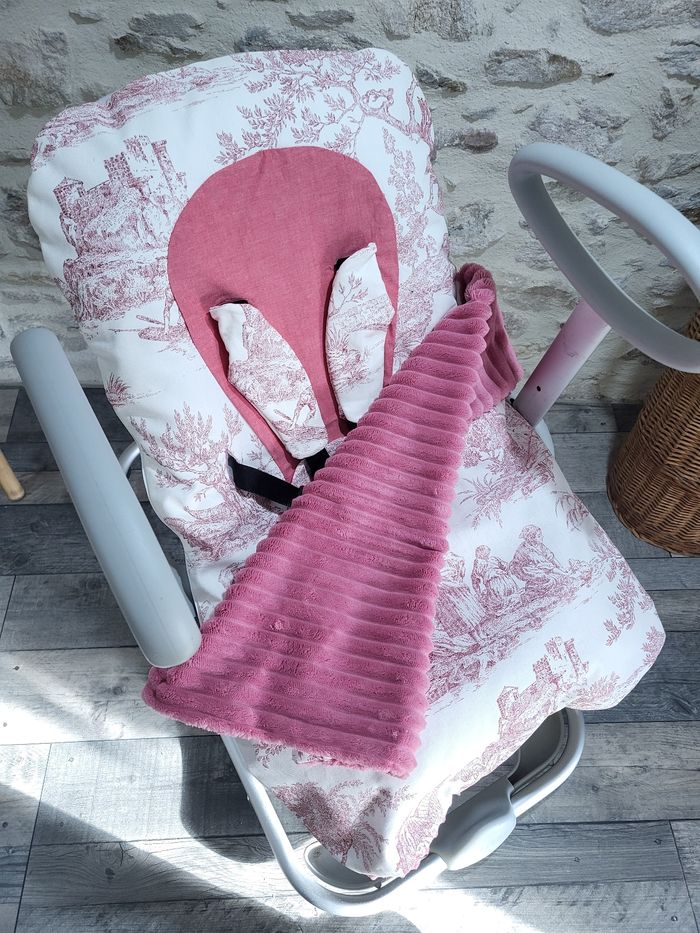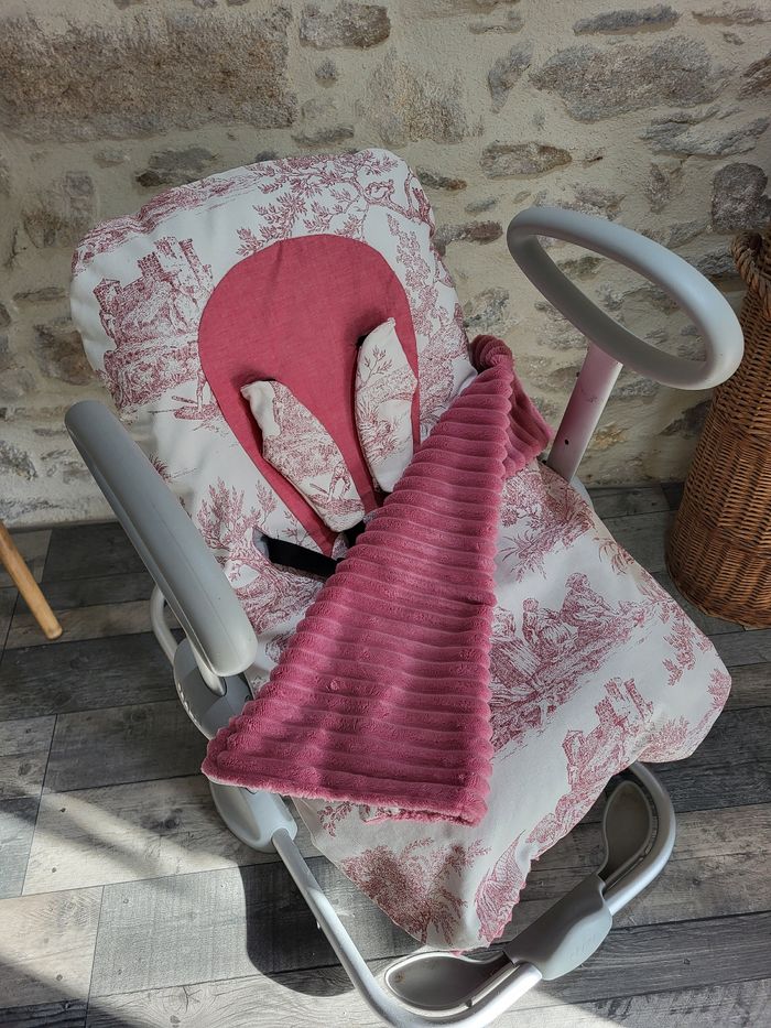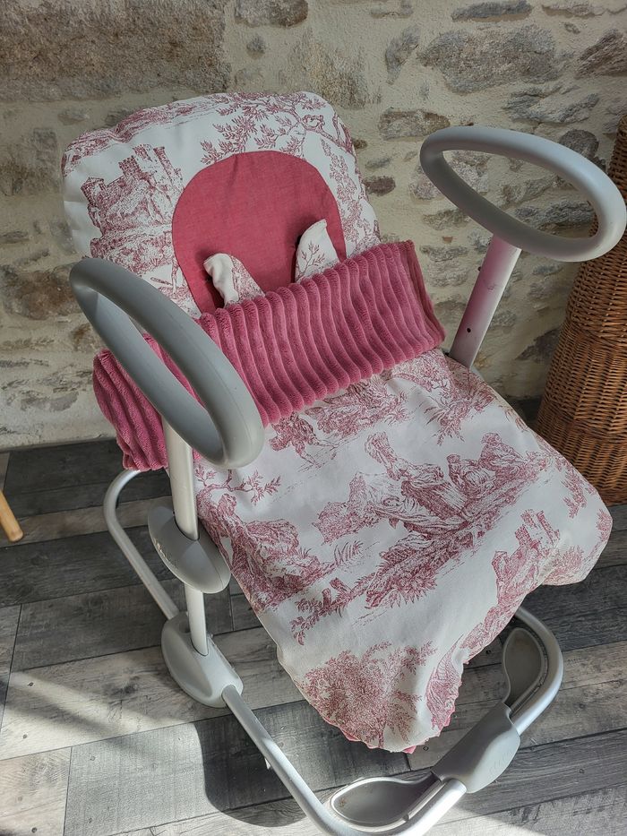 Housse qui s'ajoute à l'assise ( coussin) d'origine béaba . Imprimé toile de jouy/ rouge chambray. Couverture amovible adaptée et assortie. Accessoires sangles et entre jambe assortis.
