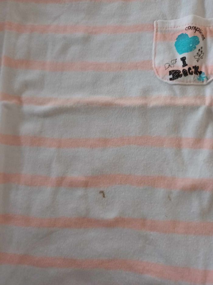 tee shirt fille couleur blanc et orange motifs rayures marque complices taille 3 ans bon etat car petite tache marron devant (voir photo)