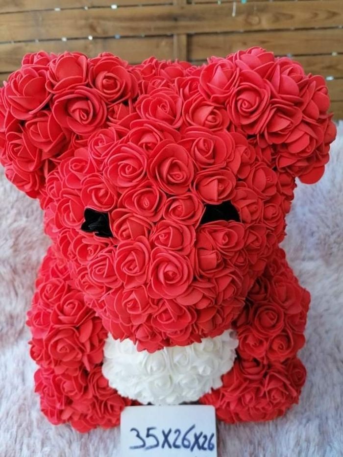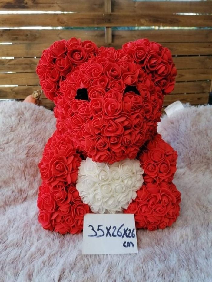 Grand ours faisant un clin d'œil en fleurs artificielles. Les fleurs sont rouges, blanches et noires. Il fait 35cm de haut, 26cm de large et 26cm de profondeur