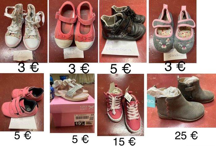 Chaussures pour bébé , 1 photo = chaussures de même taille . Différentes marques indiquées sous les chaussures . Prix indiqué sous chaque photo . Merci