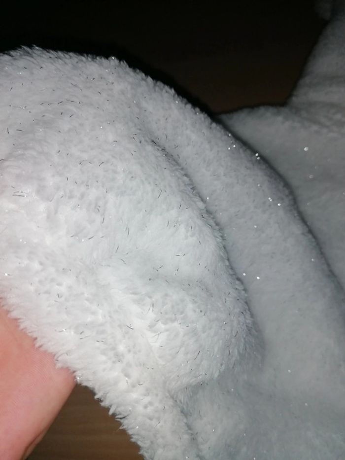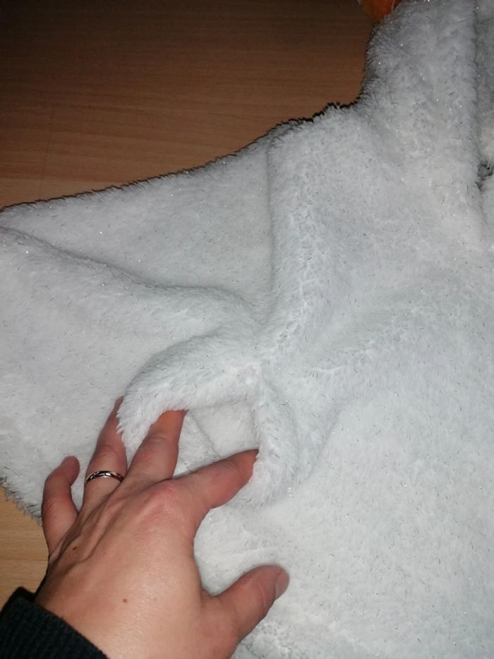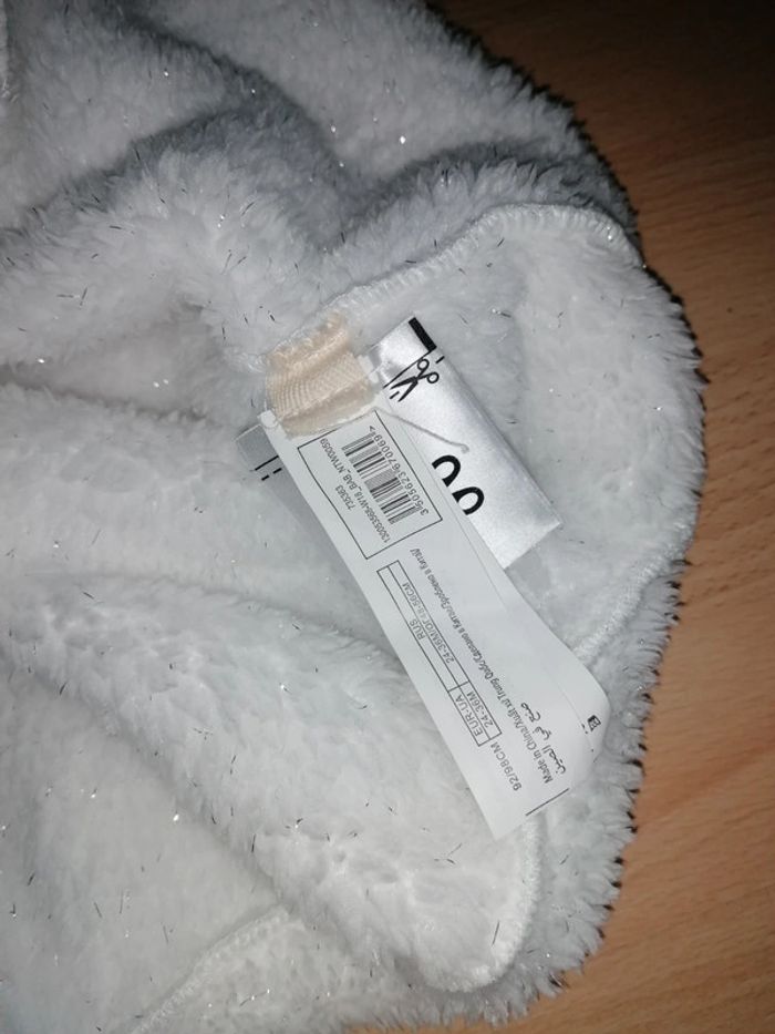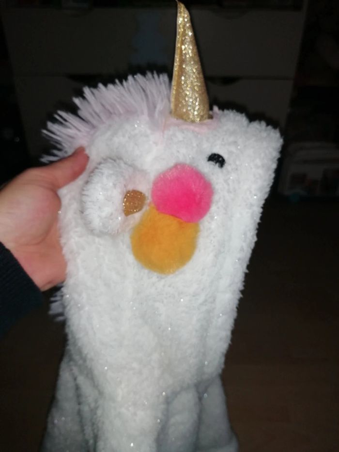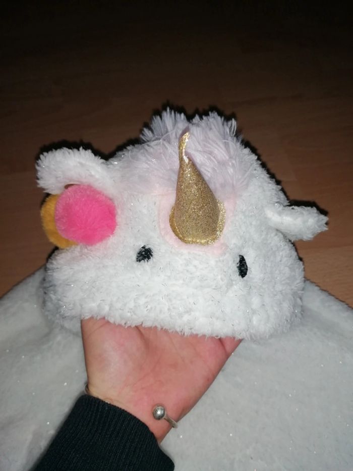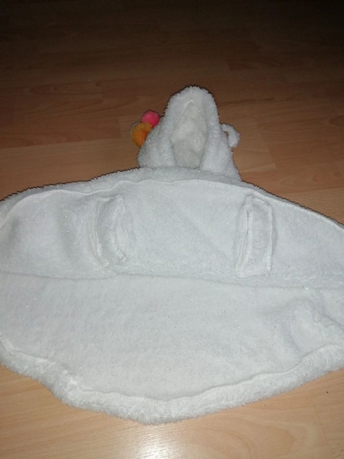 🦄 Cape blanche pailleté argenté, capuche représentant une tête de licorne 🦄, corne doré, pompons, oreilles, crêtes douce rose