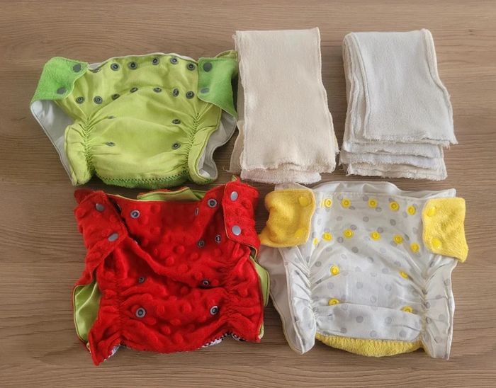 Lot de surcouches et inserts, 3 surcouches à pressions et 8 inserts, en bon état. Je ne peux malheureusement pas donner plus d'infos car je ne m'en suis pas servie