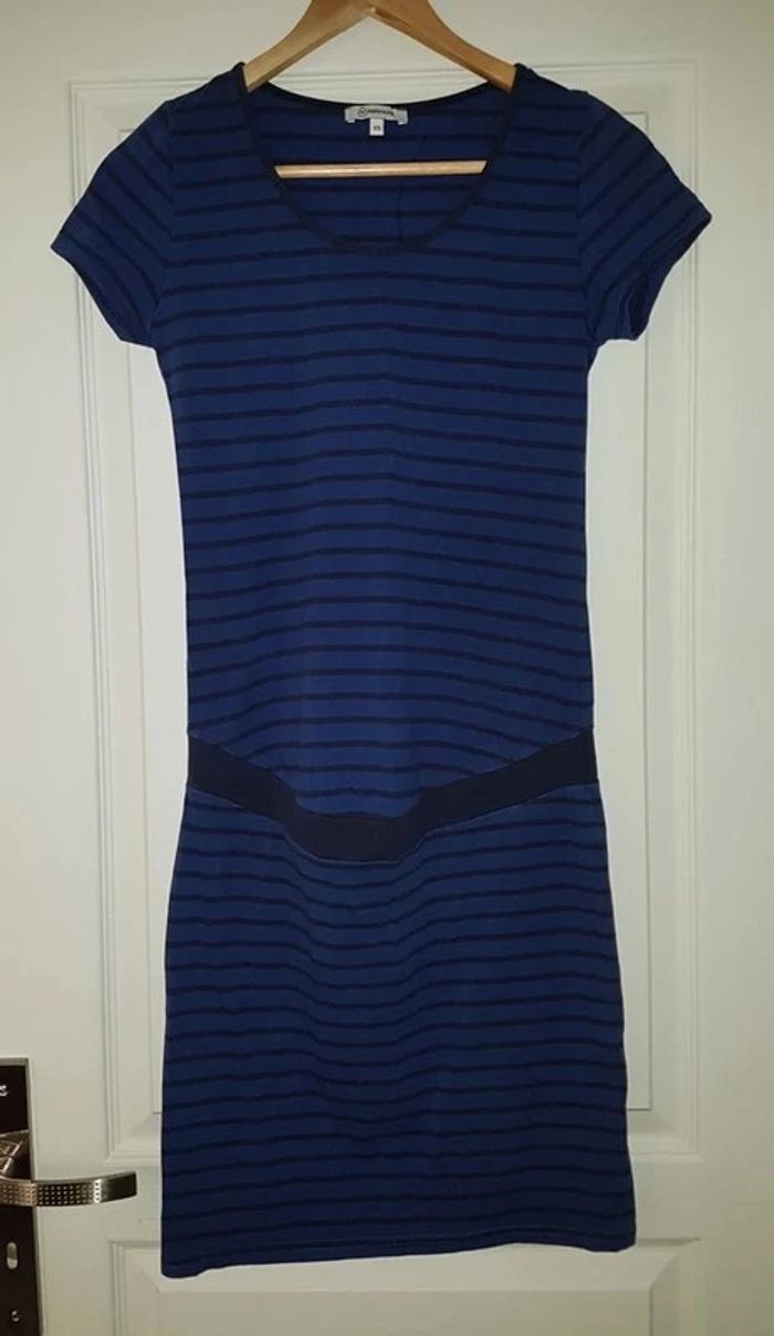 Robe de grossesse, manches courtes, de couleur marine et bleu, de la marque La Halle, taille XS, en très bon état. Article lavé pour la vente. #grossesselae72