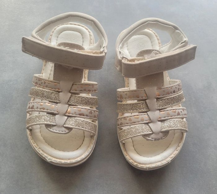 Sandales dans les tons blancs, rose gold et argentés, de la marque Nini & Girls, taille 26, en très bon état. Article lavé pour la vente.