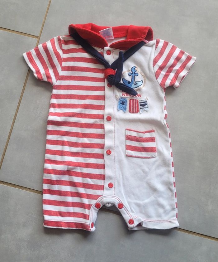 Barboteuse style marinière, dans les tons blanc et rouge, de la marque Starter's, taille 3-6 mois, en très bon état. Article lavé pour la vente. #6moislae72