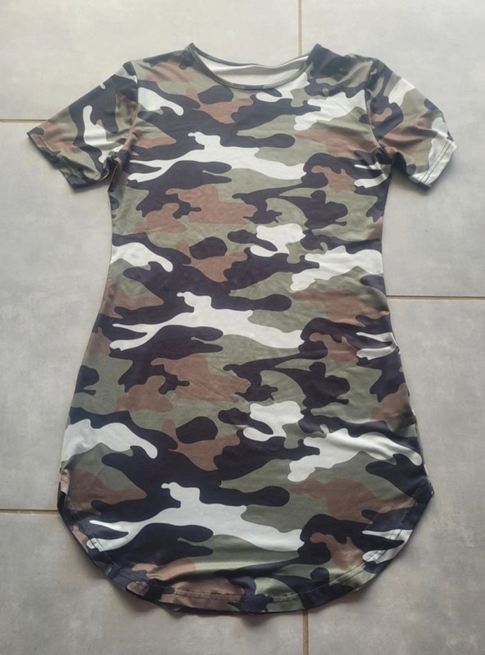 Robe courte légère, avec motifs militaire, taille L, en très bon état. Article lavé pour la vente. #40lae72