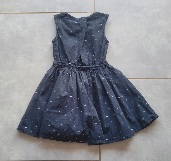 Robe de couleur marine avec motifs, légèrement ajourée dans le dos, de la marque Kiabi, taille 4 ans (98-107 cm), en très bon état si ce n'est les boutons dans le dos qui sont légèrement abîmés, Article lavé pour la vente. #4anslae72