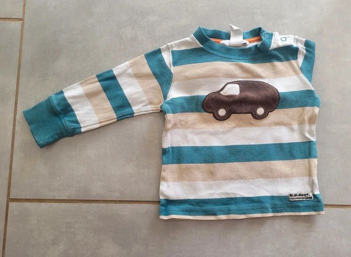 Pull dans les tons bleu, blanc et marron, de la marque H&M, taille 9-12 mois (80 cm), en très bon état. Article lavé pour la vente. #12moislae72