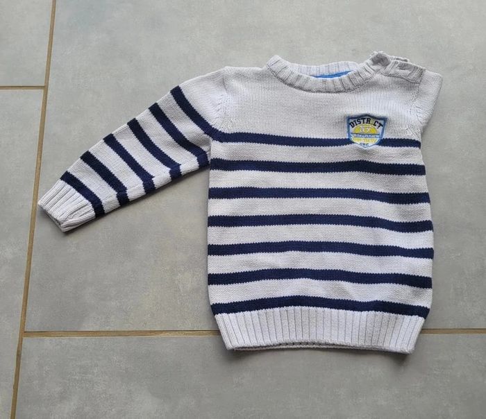 Pull en laine, de couleur blanc rayé marine, avec petit écusson au niveau de la poitrine, de la marque Orchestra, taille 12 mois (74 cm), en très bon état. Article lavé pour la vente. #12moislae72