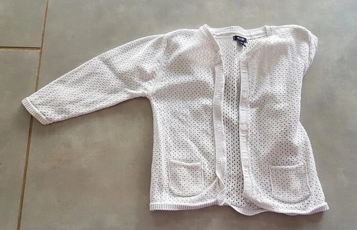 Gilet ajouré, de couleur blanc, de la marque Kiabi, taille 12 mois (73-76 cm), en très bon état. Article lavé pour la vente. #12moislae72