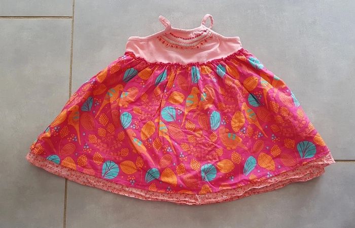 Robe légère, evasée, dans les tons roses et vert, de la marque Vertbaudet, taille 12 mois (74 cm), en très bon état. Article lavé pour la vente. #12moislae72
