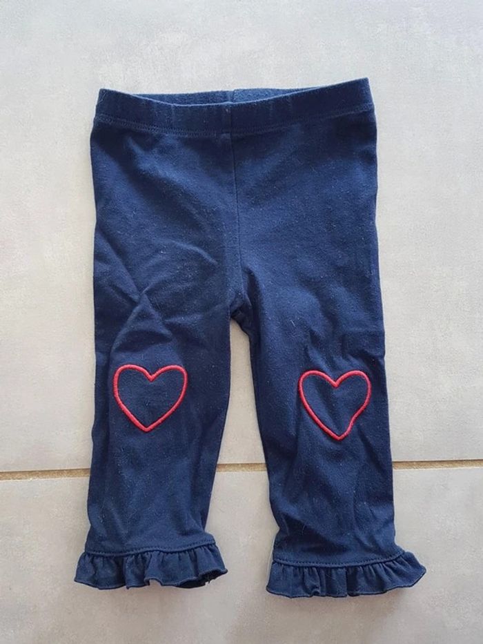 Legging avec froufrou au niveau des chevilles, de couleur marine avec motifs coeur aux genoux, taille 12 mois, en très bon état. Article lavé pour la vente. #12moislae72