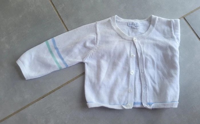 Gilet de couleur blanc avec liseré bleu et vert, de la marque Grain de Blé, taille 9 mois (71 cm), en très bon état. Article lavé pour la vente. #9moislae72