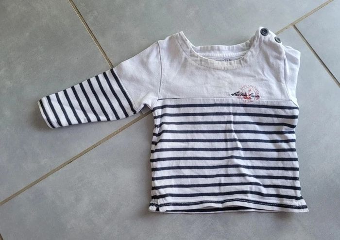 T-shirt manches longues, style marinière, de couleur blanc et noir, de la marque Orchestra, taille 9 mois (71 cm), en très bon état. Article lavé pour la vente. #9moislae72
