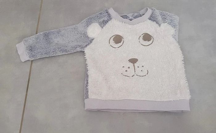 Pull en pilou, de couleur gris et blanc, taille 9 mois, en très bon état. Article lavé pour la vente. #9moislae72