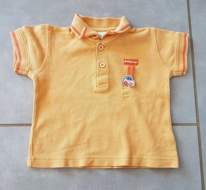Polo manches courtes, de couleur orange avec motif au niveau du coeur, taille 9 mois, en très bon état. Article lavé pour la vente. #9moislae72