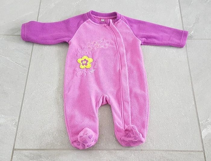 Pyjama en polaire, rose et violet, avec fermeture éclair sur le devant et petits patins anti derapants sous les pieds, taille 6 mois, en très bon état. Article lavé pour la vente. #6moislae72