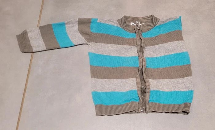 Gilet zippé, dans les tons gris et bleu, de la marque Mini Gang, taille 6 mois, en très bon état. Article lavé pour la vente. #6moislae72