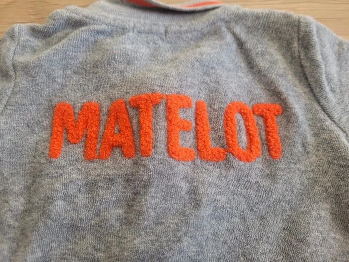 Polo manches courtes, assez épais style éponge, de couleur gris avec encolure et poche orange et inscription "Matelot" dans le dos, de la marque Kiabi, taille 6 mois (63-69 cm), en très bon état. Article lavé pour la vente. #6moislae72