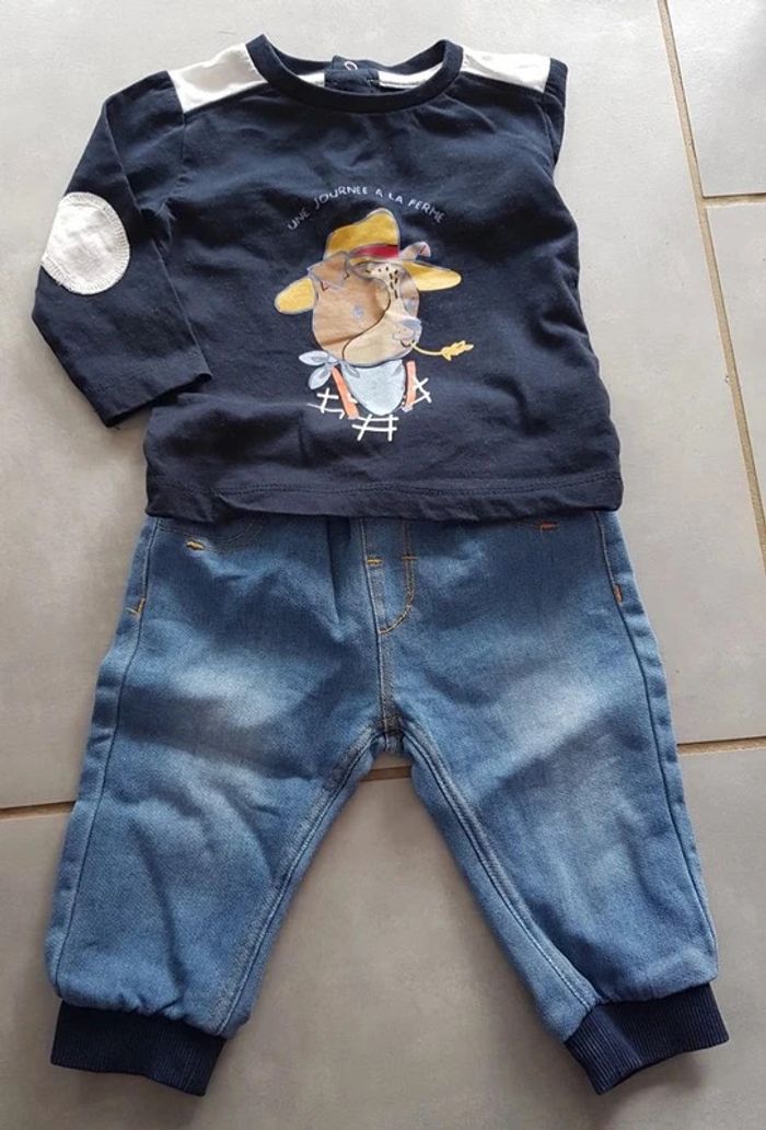 Ensemble jean et t-shirt manches longues, dans les tons foncés, taille 6 mois, neuf, jamais porté, juste lavé. Articles lavés pour la vente. #6moislae72