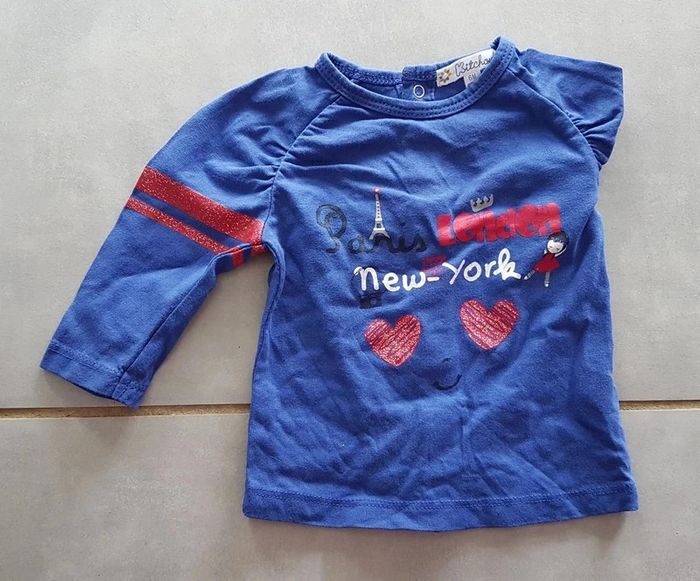 T-shirt manches longues, de couleur bleu et motifs noir, blanc et rouge, de la marque Kitchoun, taille 6 mois (67 cm), en très bon état. Article lavé pour la vente. #6moislae72