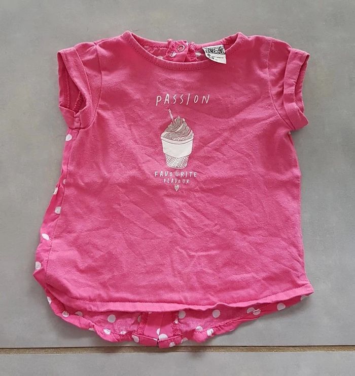 T-shirt manches courtes, de couleur rose, de la marque Tape à l'oeil, taille 6 mois (68 cm), en très bon état. Article lavé pour la vente. #6moislae72