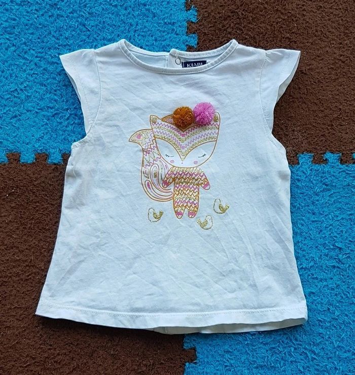 T-shirt MC blanc, avec petit personne rose et doré et pompons rose et orange, de la marque Kiabi, taille 6 mois, en très bon état. Article lavé pour la vente. #6moislae72