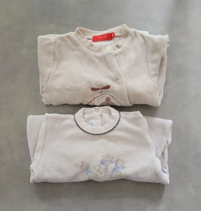Lot de 2 pyjamas en velours, un bleu clair de la marque In Extenso et l'autre blanc et gris clair de la marque Gemo, taille 3 mois, en très bon état. Articles lavés pour la vente. #3moislae72