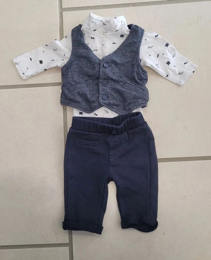 Ensemble très habillé, body blanc avec motifs bleu, gilet sans manches et pantalon marine, de la marque Kiabi, taille 3 mois (56-62 cm), en très bon état. Articles lavés pour la vente. #3moislae72