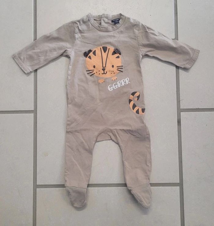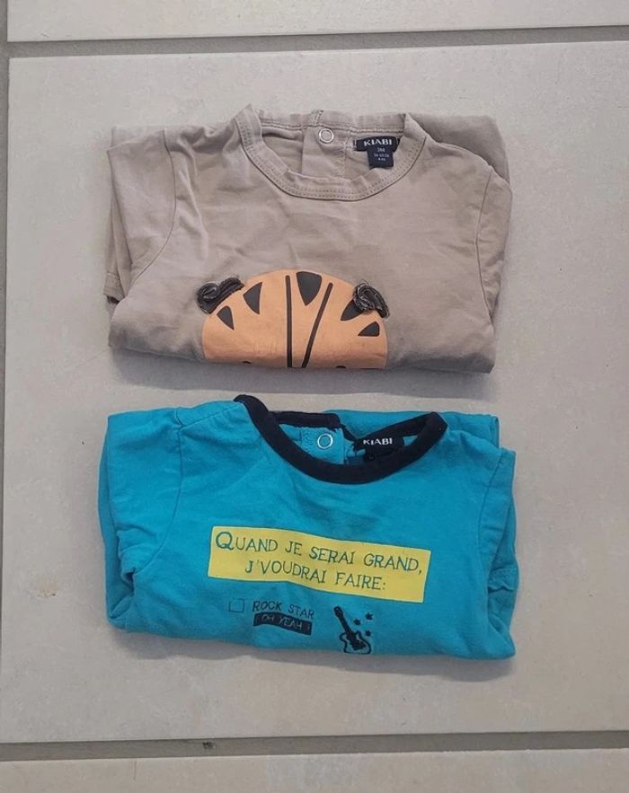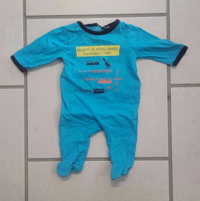 Lot de 2 pyjamas en coton, un marron et un bleu clair, de la marque Kiabi, taille 3 mois (56-62 cm), en très bon état. Articles lavés pour la vente. #3moislae72