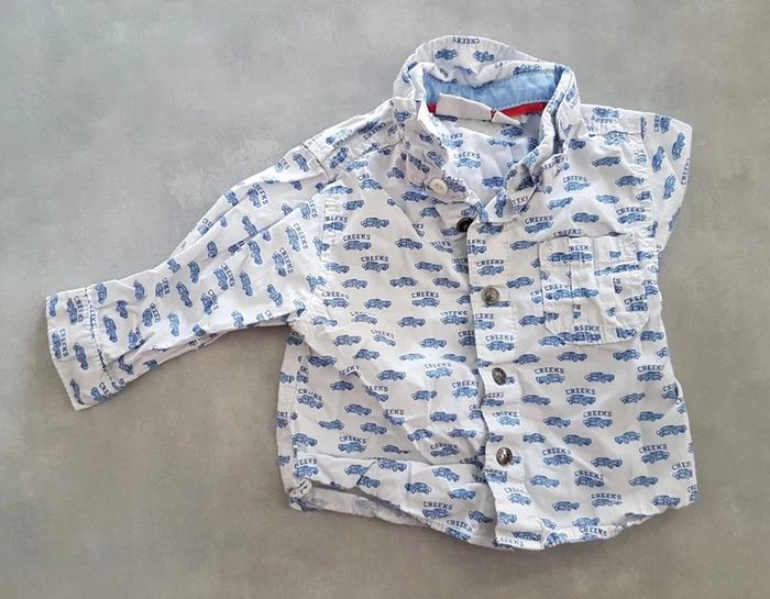 Chemise manches longues, de couleur blanche avec motifs voitures bleues, de la marque Creeks, taille 3 mois, en très bon état. Article lavé pour la vente. #3moislae72