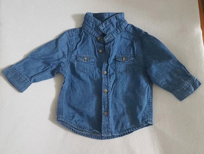 Chemise manches longues, de couleur bleue, de la marque Kiabi, taille 3 mois (56-62 cm), en très bon état. Article lavé pour la vente. #3moislae72