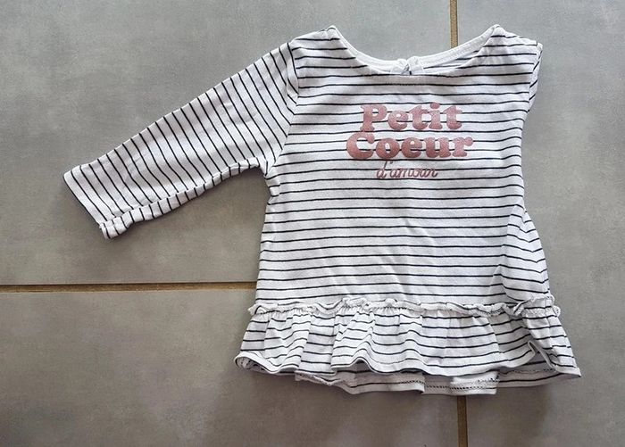 T-shirt manches longues, blanc rayé noir, avec froufrou sur le bas et inscription "petit coeur d'amour", de la marque Kiabi, taille 3 mois (56-62 cm), en très bon état. Article lavé pour la vente. #3moislae72