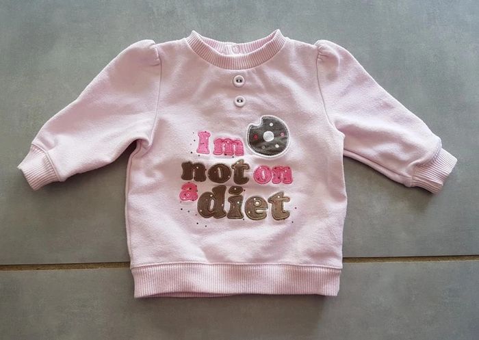 Sweat, de couleur rose pâle avec inscription "Im not on a diet" et motif donut's, de la marque Tex, taille 3 mois, en très bon état. Article lavé pour la vente. #3moislae72