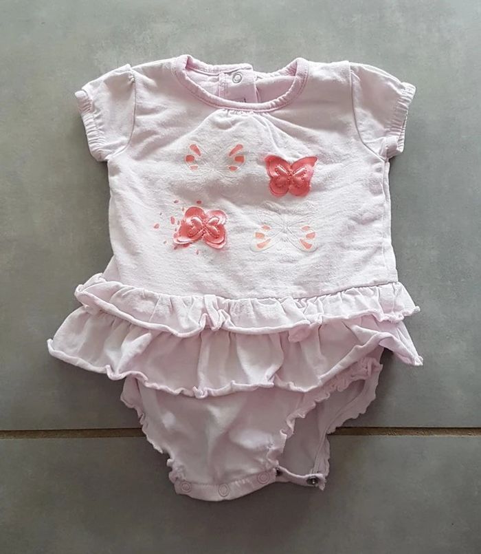 T-shirt manches courtes, de couleur rose pâle, avec motifs papillons, avec body intégré, de la marque Gemo, taille 3 mois, en très bon état. Article lavé pour la vente. #3moislae72