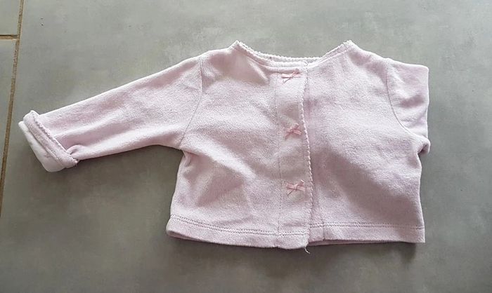 Gilet en velours, de couleur rose pâle, fermeture par pressions, taille 3 mois, en très bon état. Article lavé pour la vente. #3moislae72