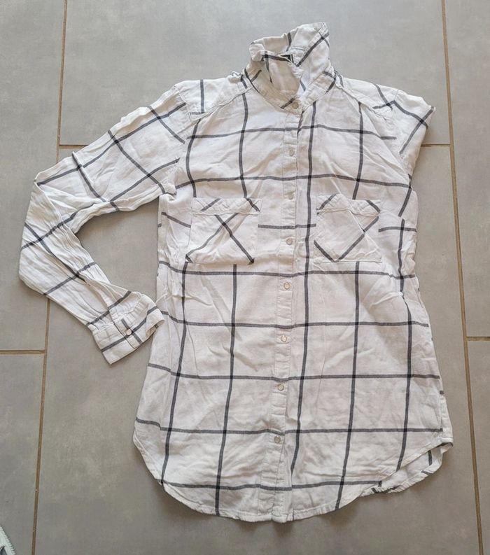 Chemise légère, manches longues, à carreaux, de couleur blanc et gris, de la marque Pimkie, taille XS, en très bon état. Article lavé pour la vente. #34lae72