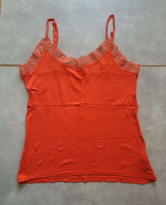 Débardeur orné de dentelle, de couleur orange, de la marque U Collection, taille 36, en très bon état. Article lavé pour la vente. #36lae72