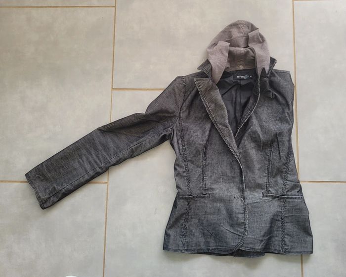 Veste dans les tons noirs et gris, avec capuche grise, de la marque Mystic, taille 38, en très bon état. Article lavé pour la vente. #38lae72