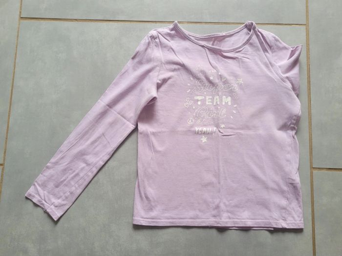 T-shirt manches longues, de couleur mauve, avec motif, de la marque In Extenso, taille 8 ans (119-131 cm), en très bon état. Article lavé pour la vente. #8anslae72
