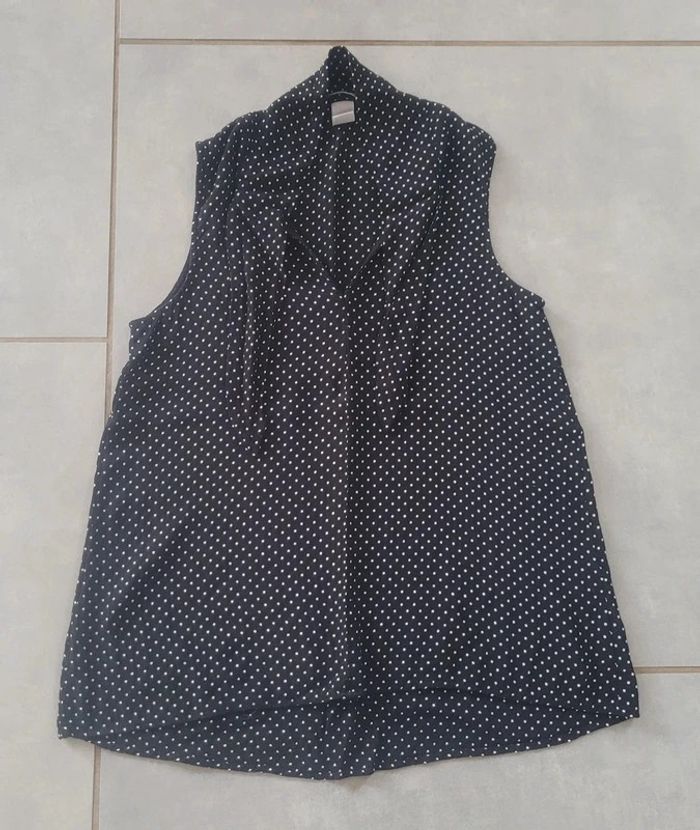 Blouse sans manches, de couleur noire a pois blanc, petit lien a nouer au niveau du cou, de la marque H&M, taille 34, en très bon état. Article lavé pour la vente. #34lae72
