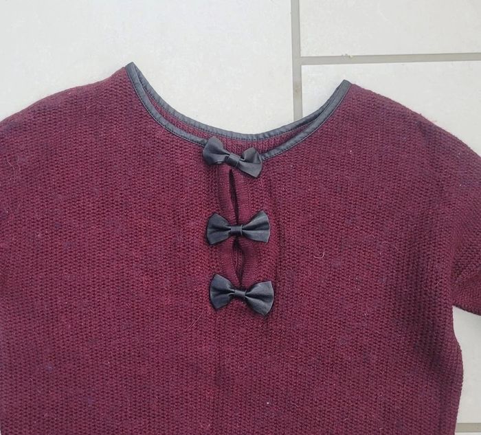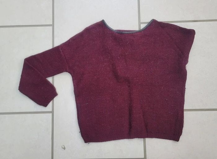 Pull en laine, avec détails nœuds en cuir dans le dos, de couleur bordeaux, de la marque Camaïeu, taille 2, en très bon état. Article lavé pour la vente. #38lae72